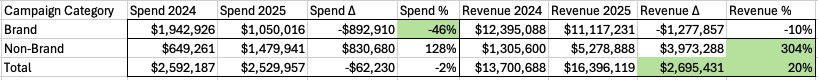 Non-brand campaigns scaled dramatically while overall spend increased only modestly.
